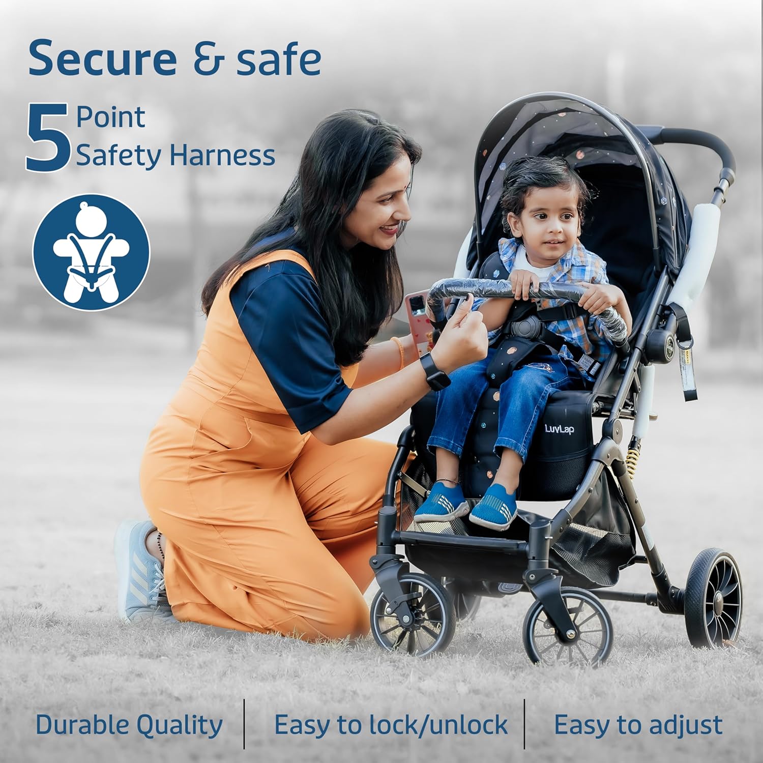 - 5 point safety harness for child safety, Extended Foldable Canopy for maximum comfort