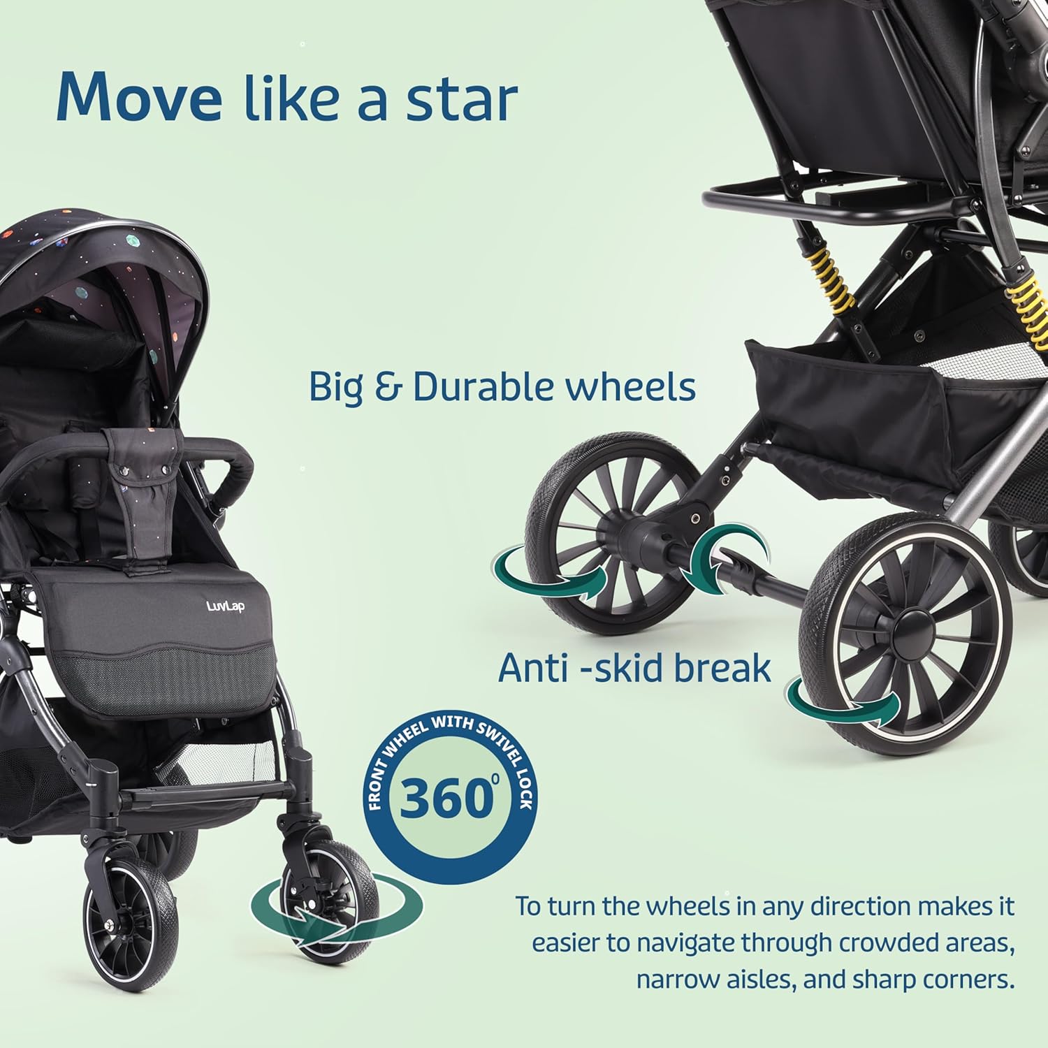 LuvLap Apollo Stroller with Multi-Position Recline, Lightweight, 3-Point Safety Harness, Rear Wheel Brakes, Swivel Front Wheels, Storage Basket, Weight Capacity 15Kgs