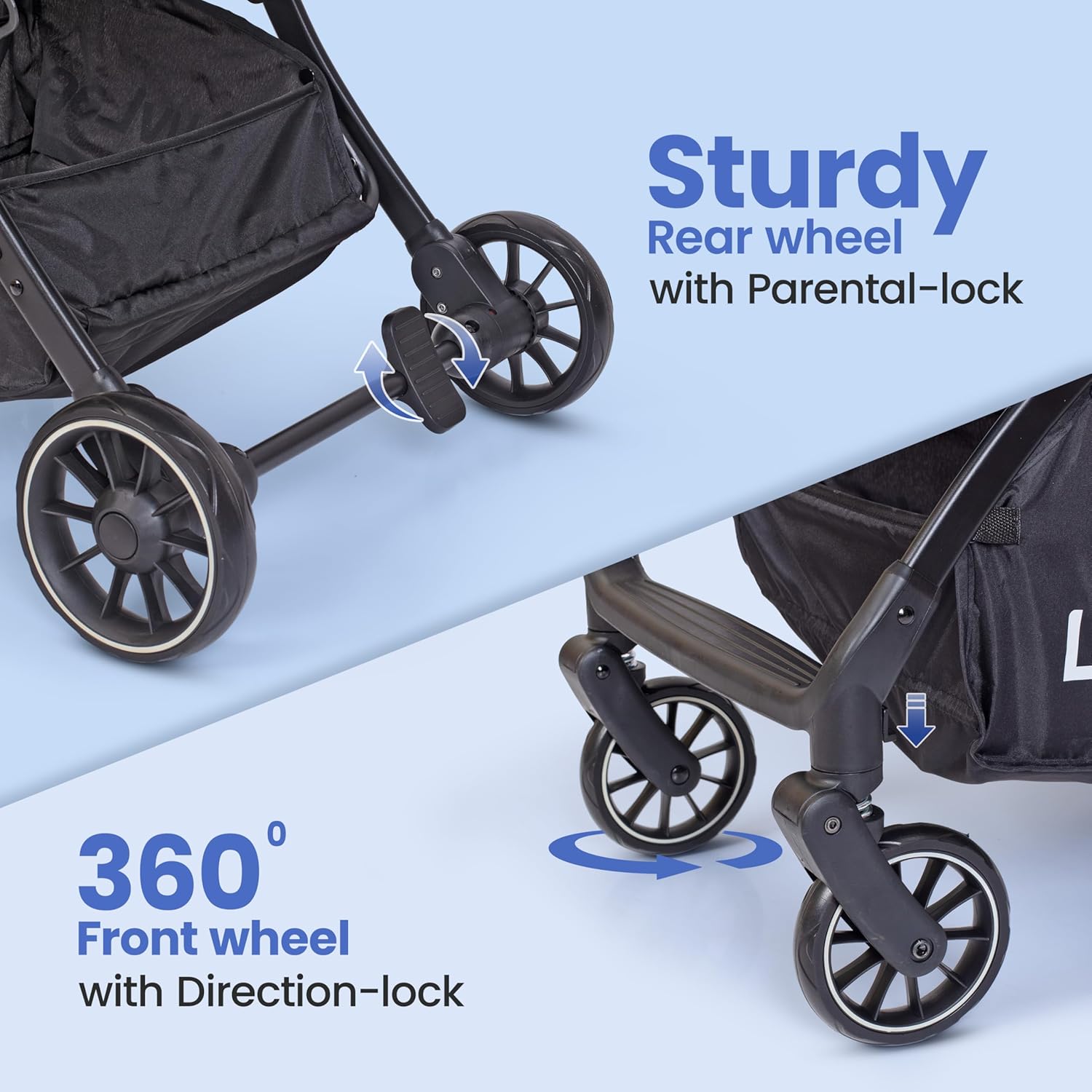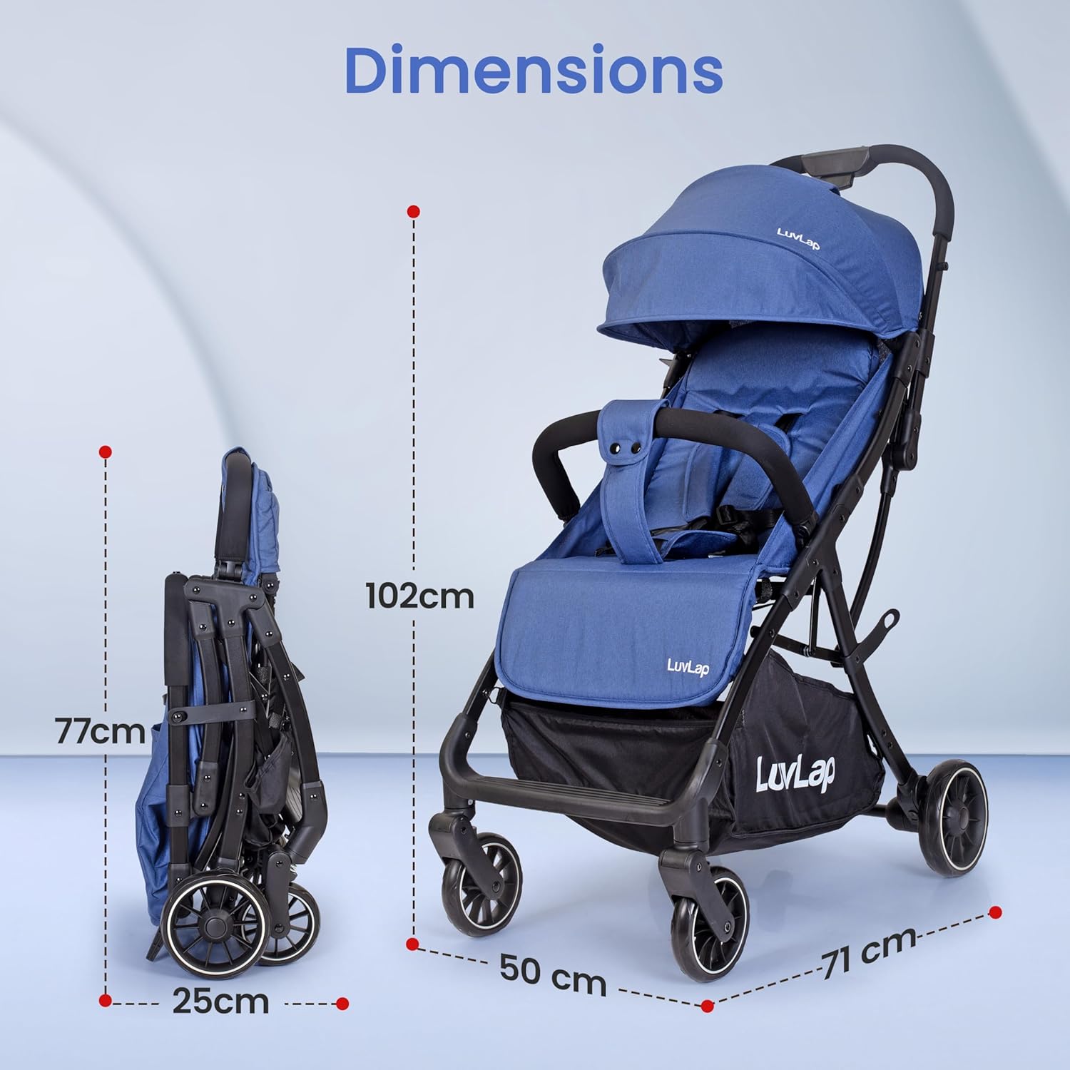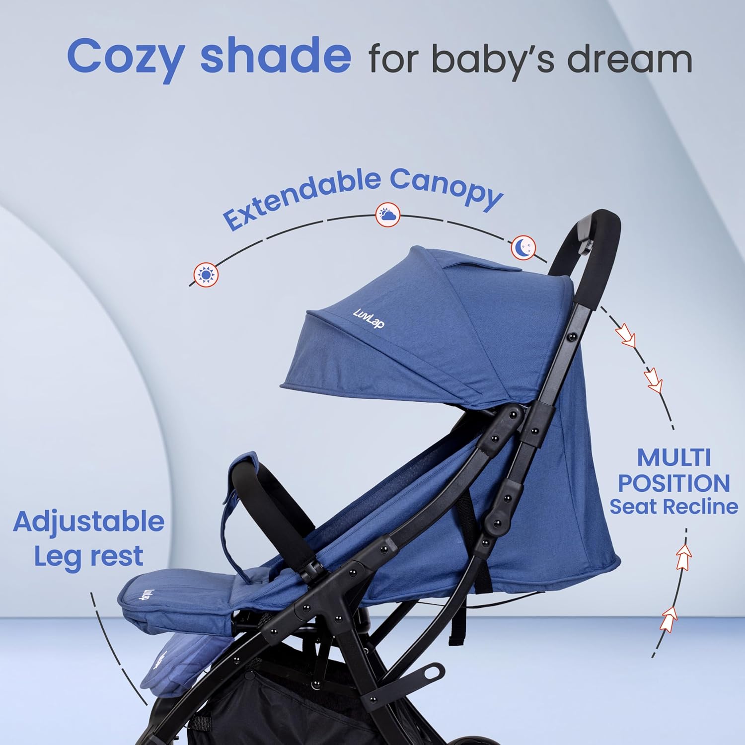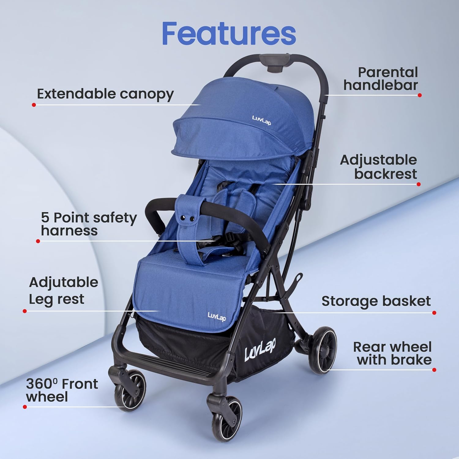 LuvLap Apollo Stroller with Multi-Position Recline, Lightweight, 3-Point Safety Harness, Rear Wheel Brakes, Swivel Front Wheels, Storage Basket, Weight Capacity 15Kgs