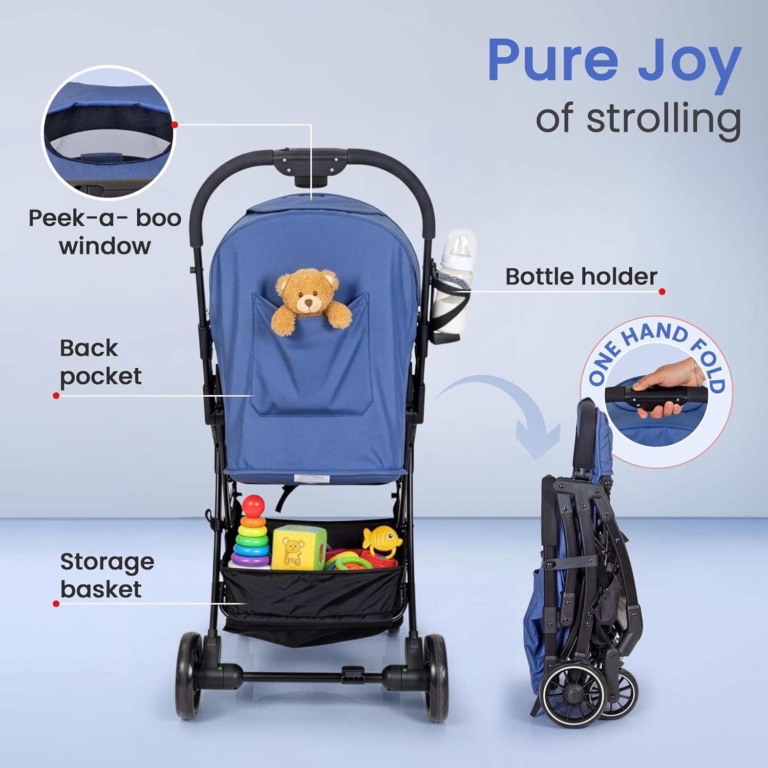 - The stroller comes with one touch one hand fold … makes it ideal for travelling parents