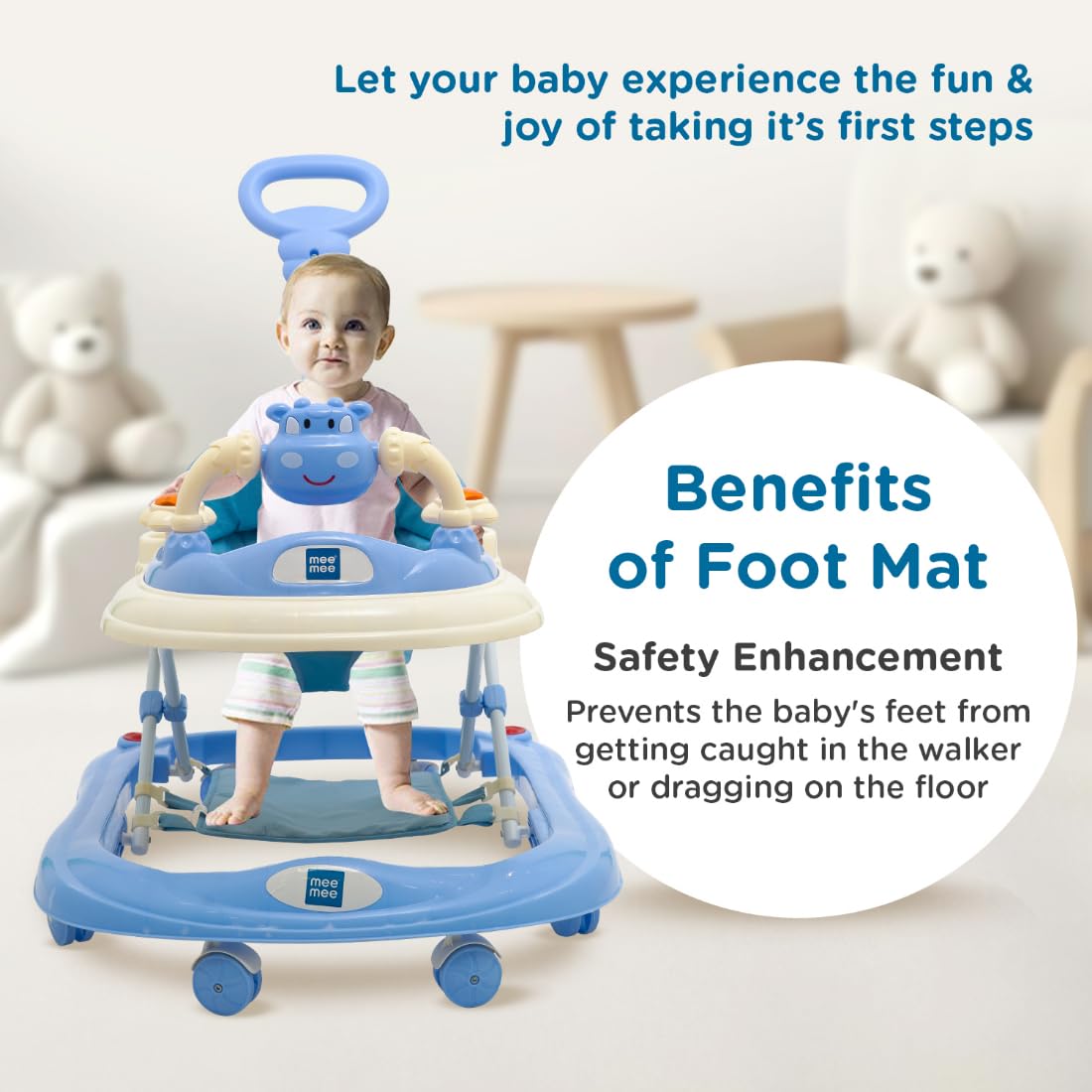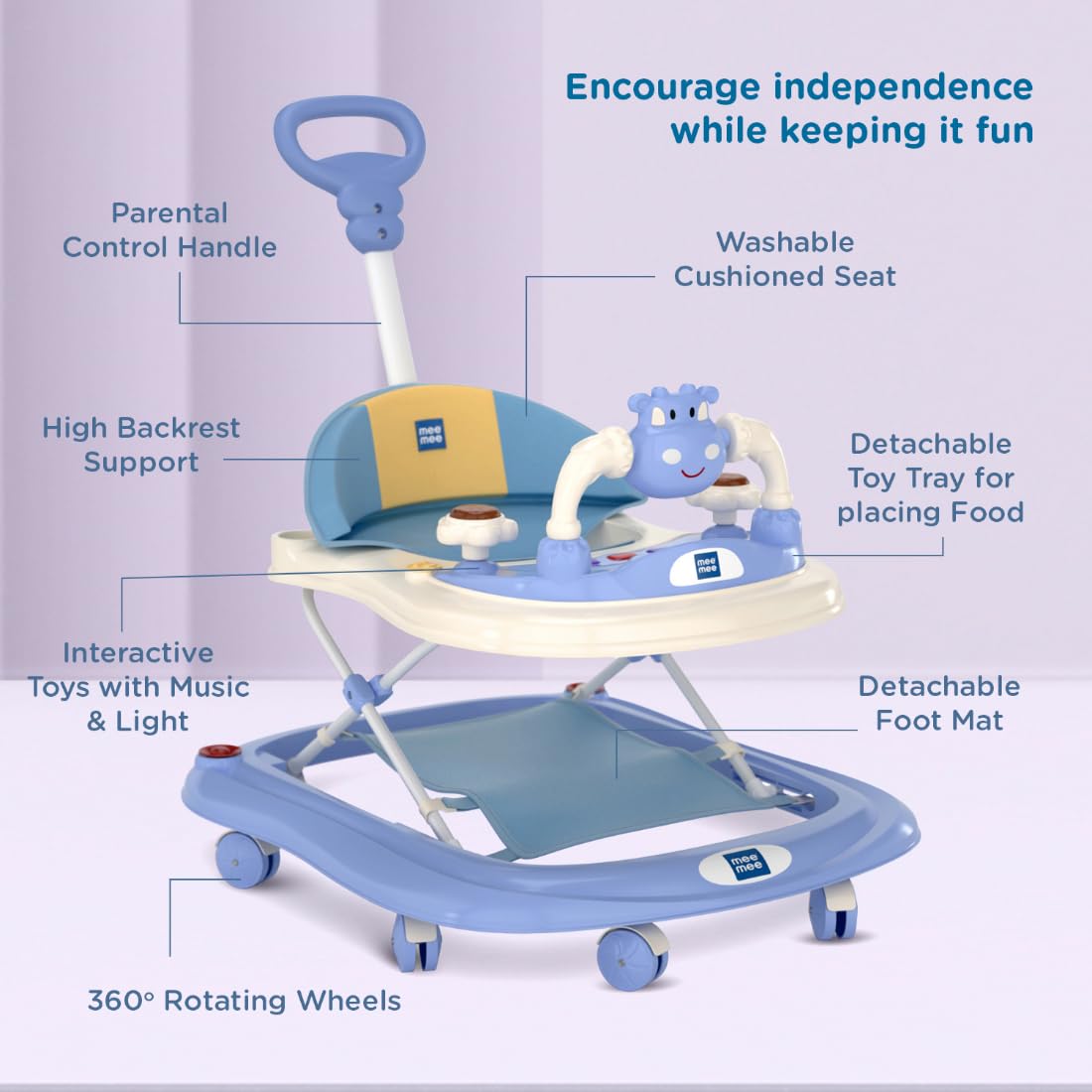 Empower your little one’s mealtime independence with the detachable and easy-to-clean feeding tray of Mee Mee’s walker. Designed for convenience, it offers ample space, encouraging self-feeding while ensuring a mess-free experience