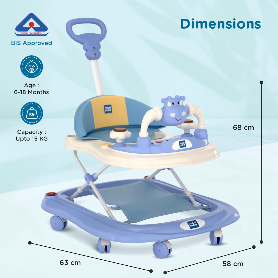 Experience enhanced mobility with the Mee Mee walker’s 360-degree rotating wheels, allowing effortless movement in any direction. Navigate smoothly and ensure your little one explores with ease and safety.
