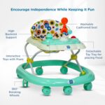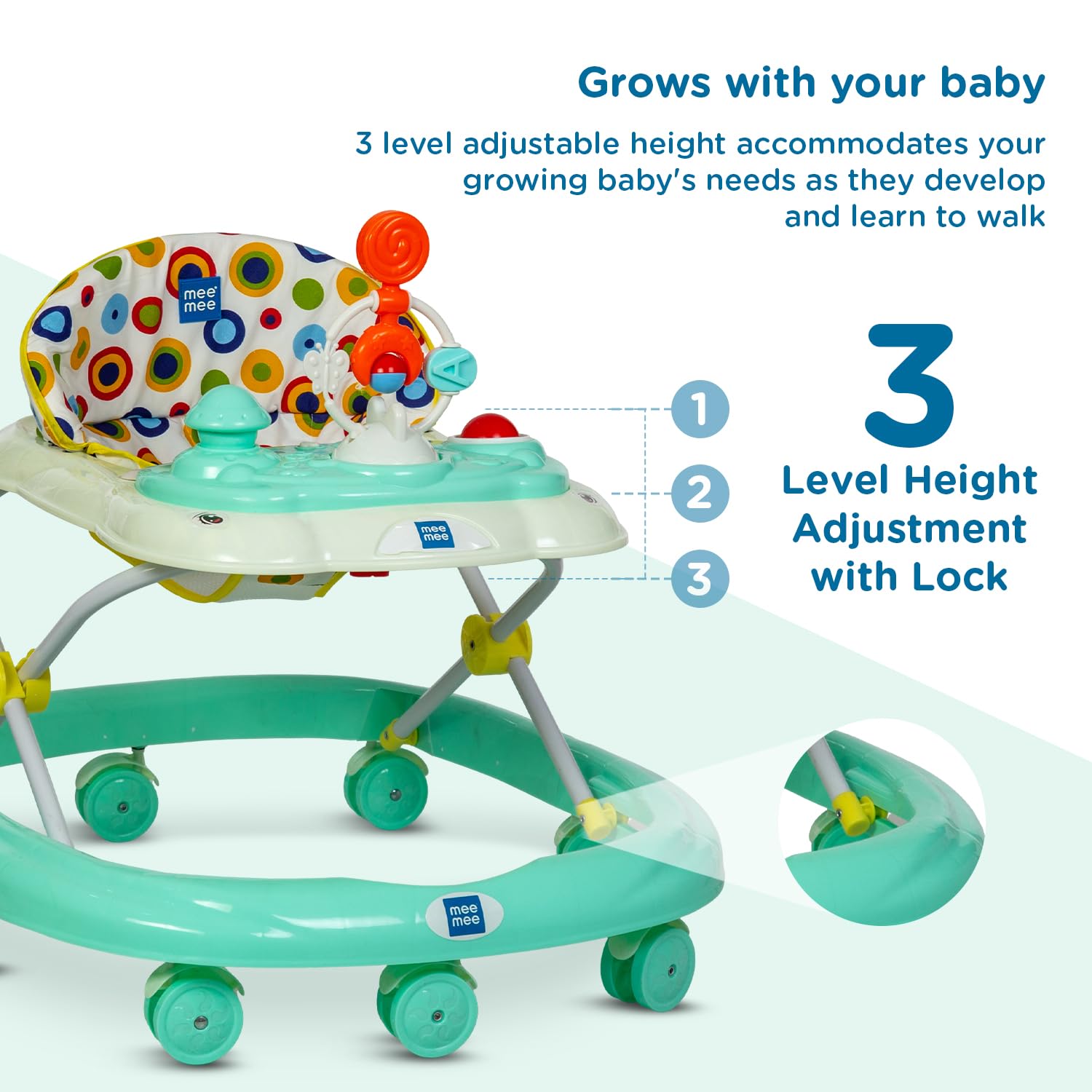 Mee Mee Baby Walker with 3-Level Adjustable Height – Green | Musical & Detachable Food Tray, 360° Wheels & Comfortable Cushion | BIS Certified Baby Activity Walker for 6-18 Months, Up to 15 Kg