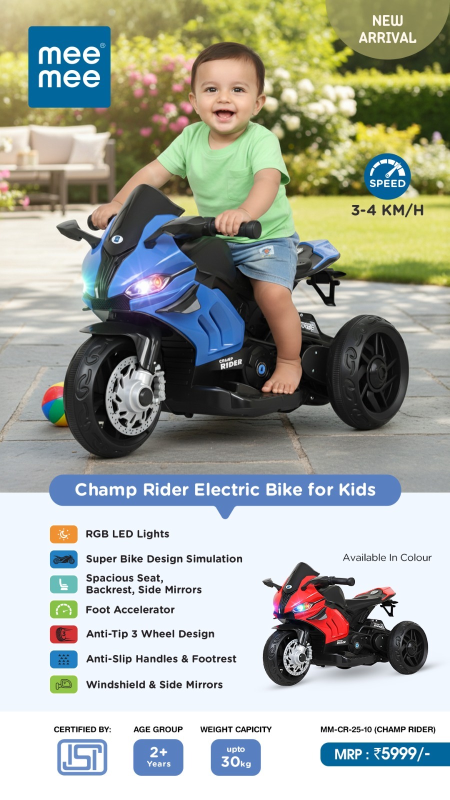 Mee Mee Champ Rider Electric Bike|3 wheel anti tip design| antislip handles