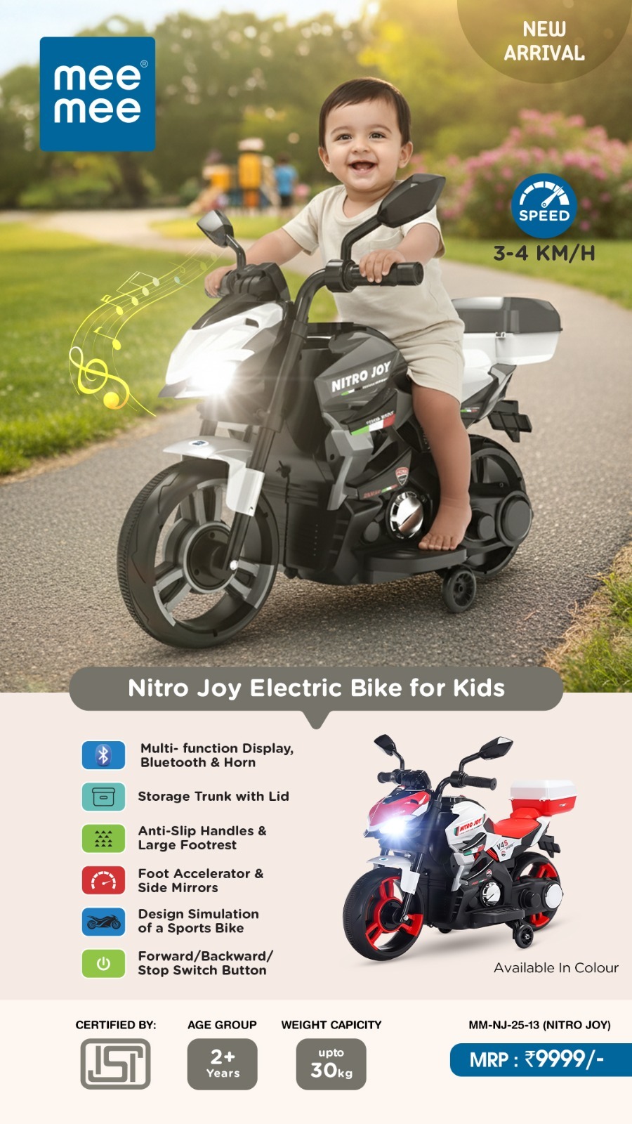 Built with durable materials and ISI certification, this kids electric bike supports a weight capacity of up to 30 kg, making it reliable for everyday play. The stable design and balanced wheels help toddlers learn coordination and motor skills while enjoying outdoor activities.