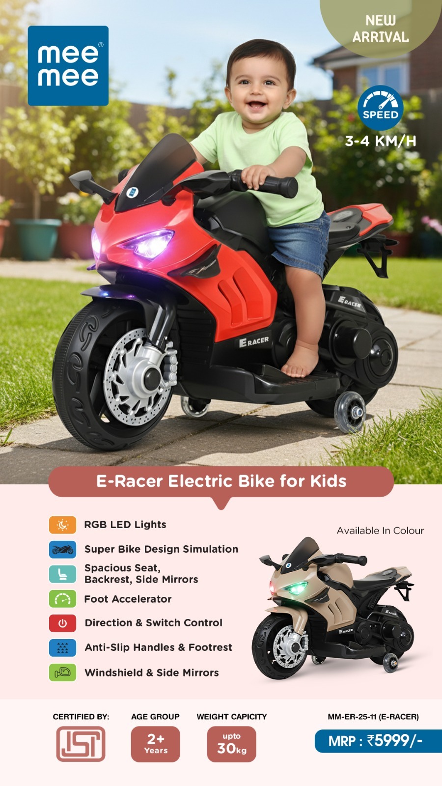 The Mee Mee E-Racer Electric Bike features vibrant RGB LED lights that make every ride visually exciting, especially during evening playtime. Its superbike design simulation gives children the feel of riding a real motorcycle while ensuring stability and comfort with anti-slip handles and large footrests.
