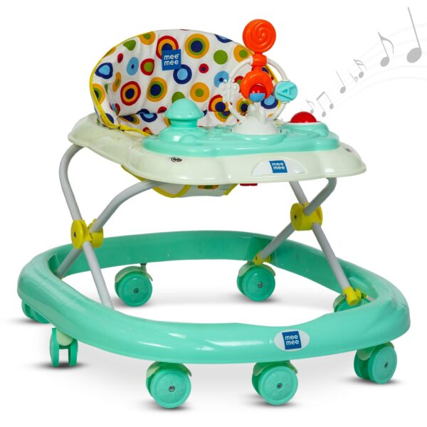 Mee Mee Baby Walker with 3-Level Adjustable Height – Green | Musical & Detachable Food Tray, 360° Wheels & Comfortable Cushion | BIS Certified Baby Activity Walker for 6-18 Months, Up to 15 Kg