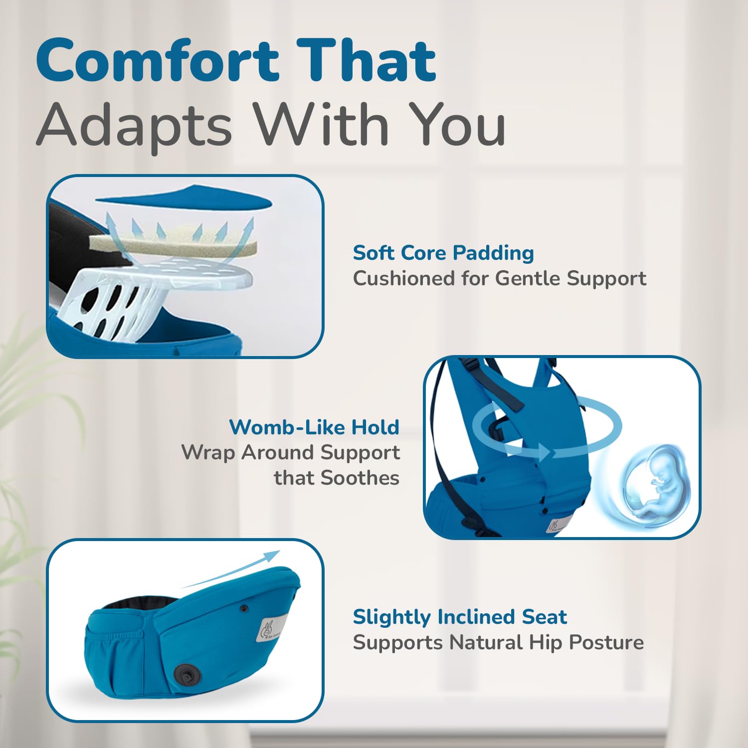 - Ergonomic “M” Position: It is also designed with an ergonomic “M” position to provide the baby with a supportive environment for healthy hip development, spine support, and comfortable posture, as recommended by the paediatricians.