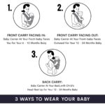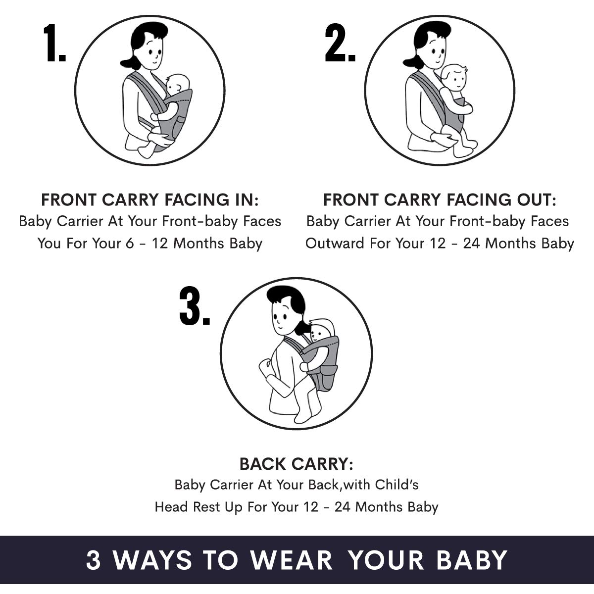 - Carry in 3 ways: You can carry your baby in 3 different ways – front carry face in, front carry facing out and back carry.