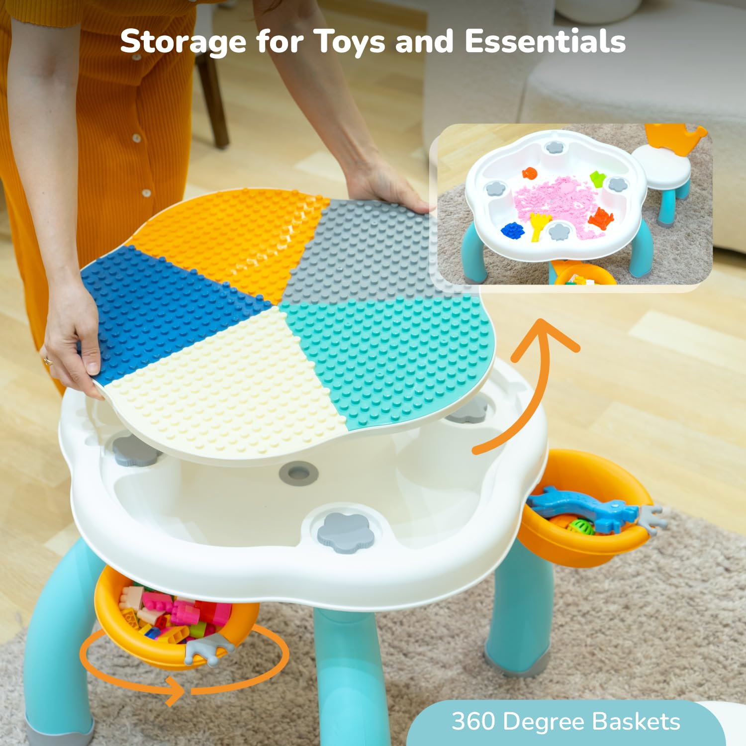 - Removable 360° Storage Baskets: The baskets make it easy to access materials like stationary or toys.