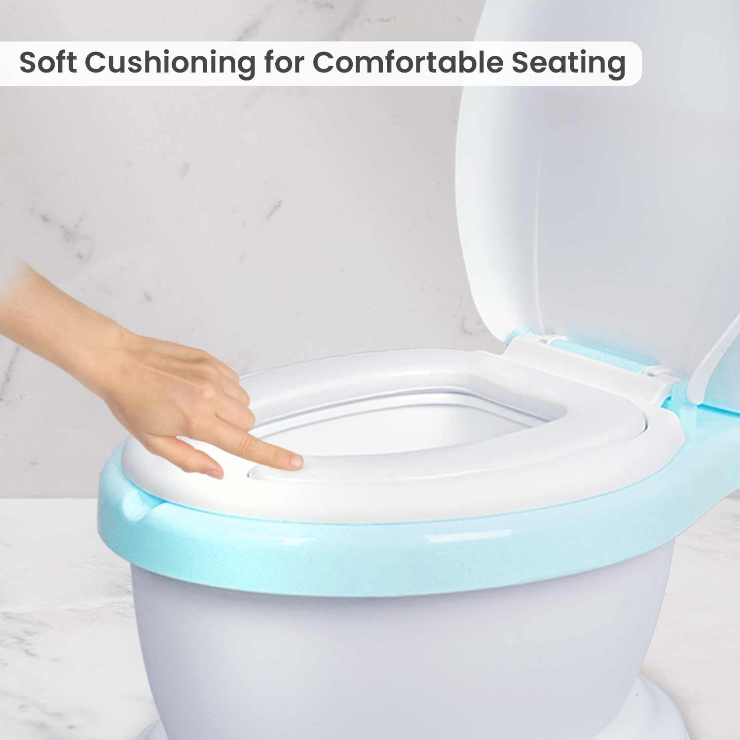 - Ergonomic Backrest & Soft Cushion: This potty seat is thoughtfully shaped for your child’s comfort. The ergonomic backrest supports a healthy spine posture, while the soft, cushioned seat prevents discomfort and skin pressure, encouraging your little one to sit longer with ease.