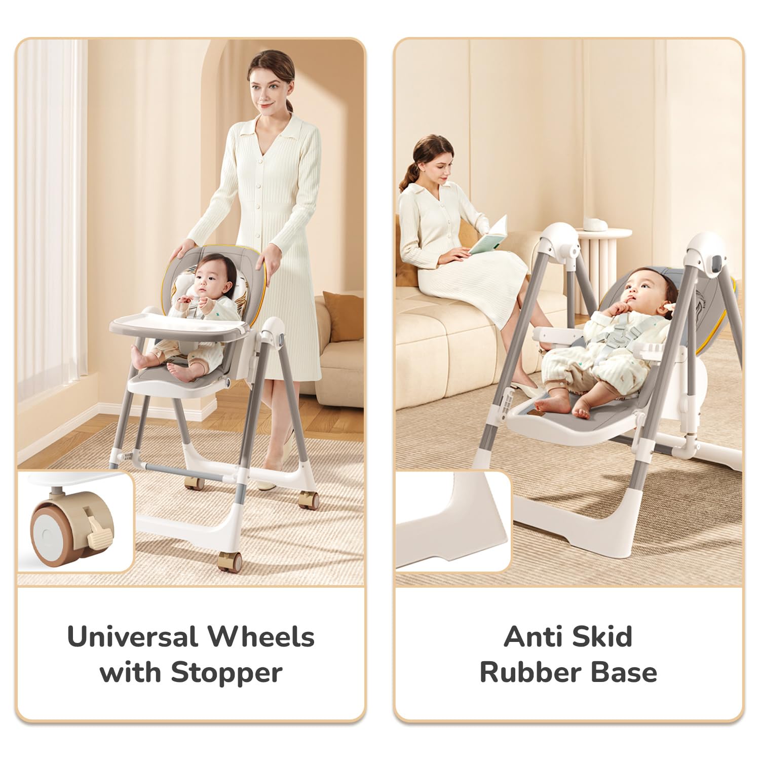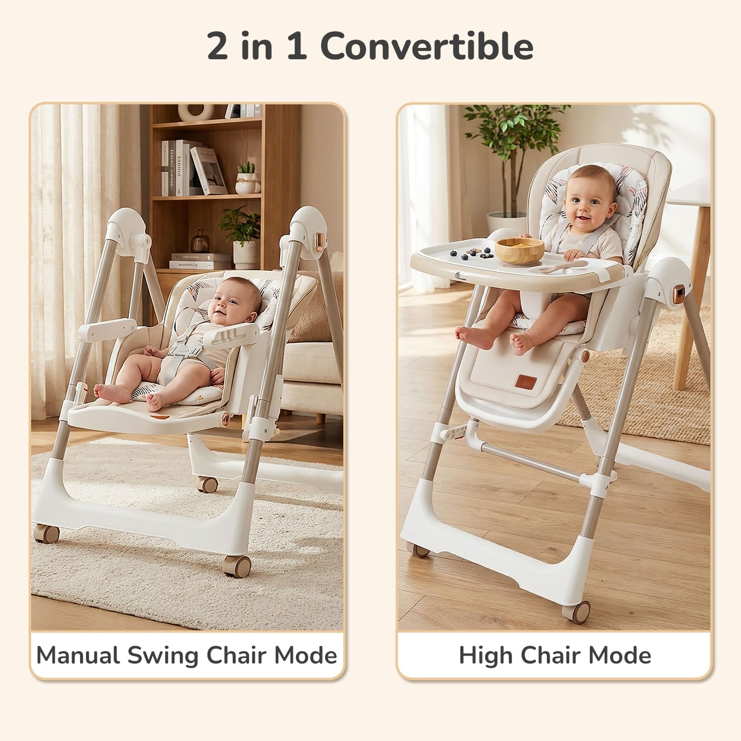 - 2-in-1 Multipurpose High Chair with Swing: Effortlessly transform from highchair into a swing providing your baby with versatile seating options that grow with them.