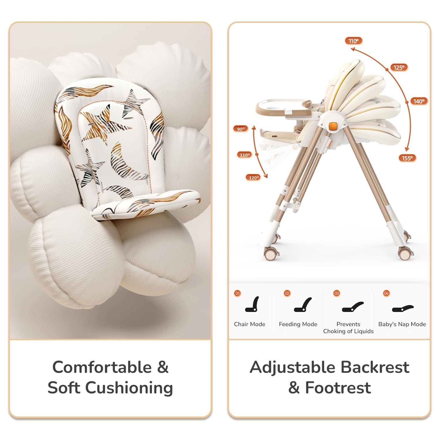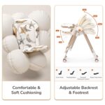 - Reclinable Backrest and Footrest with PU Cushion: The plush PU cushion and adjustable backrest and footrest ensure your baby is always comfortable, whether they’re eating, playing or napping.