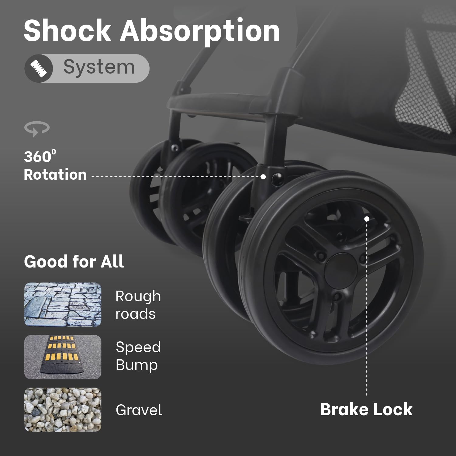- Suspension Wheels With Link Brakes: It makes strolls even more comfortable by minimizing the jerks and link brakes helps parents to keep the stroller in control.
