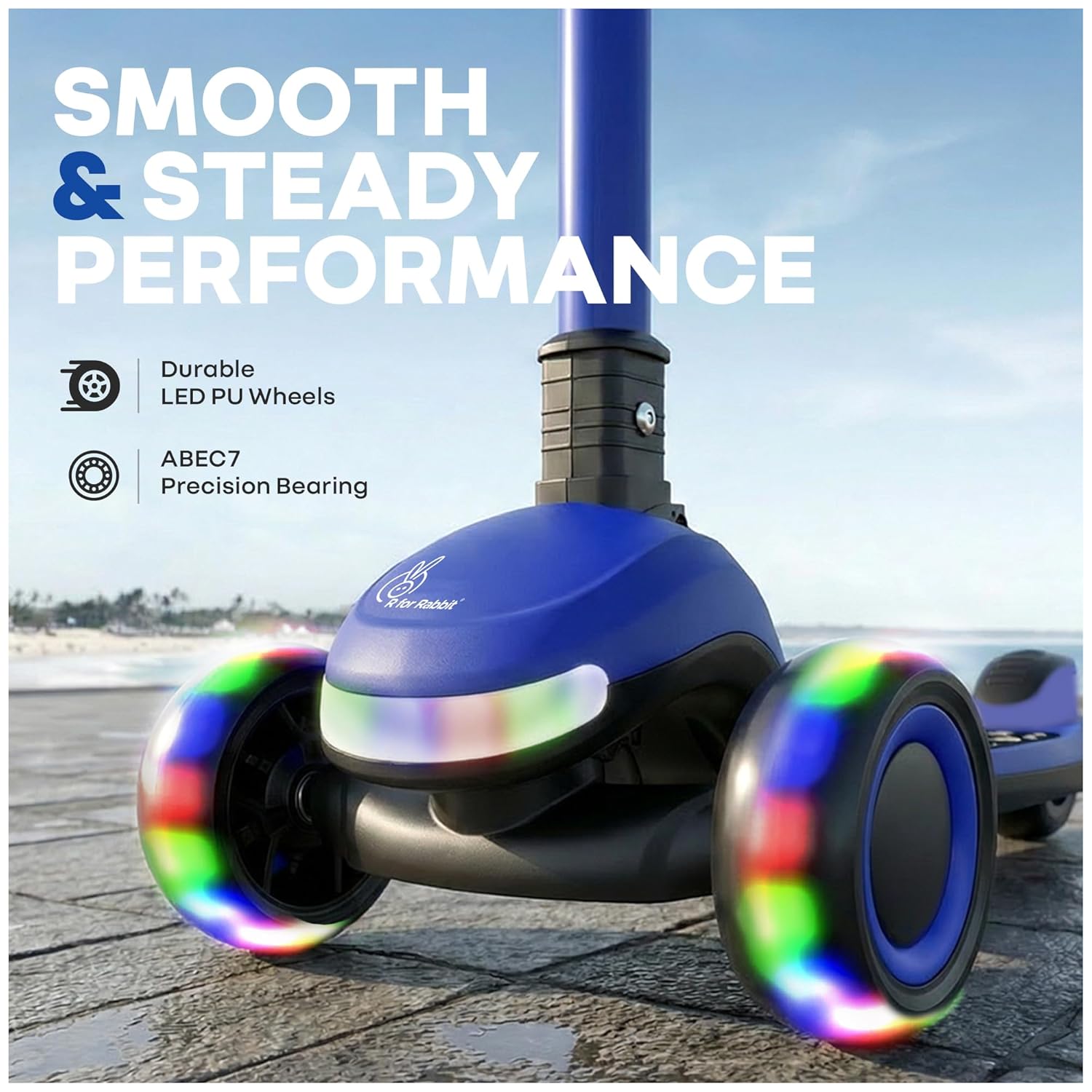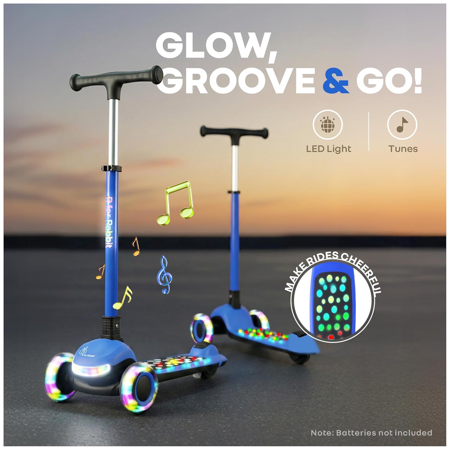 R for Rabbit Road Runner Neo Kick Scooter for Kids with Lights & Music, 4-Level Adjustable Height Gravity Steering, PU LED Wheels for 3+ Years Baby Boys & Girls, Up to 75 KG Weight