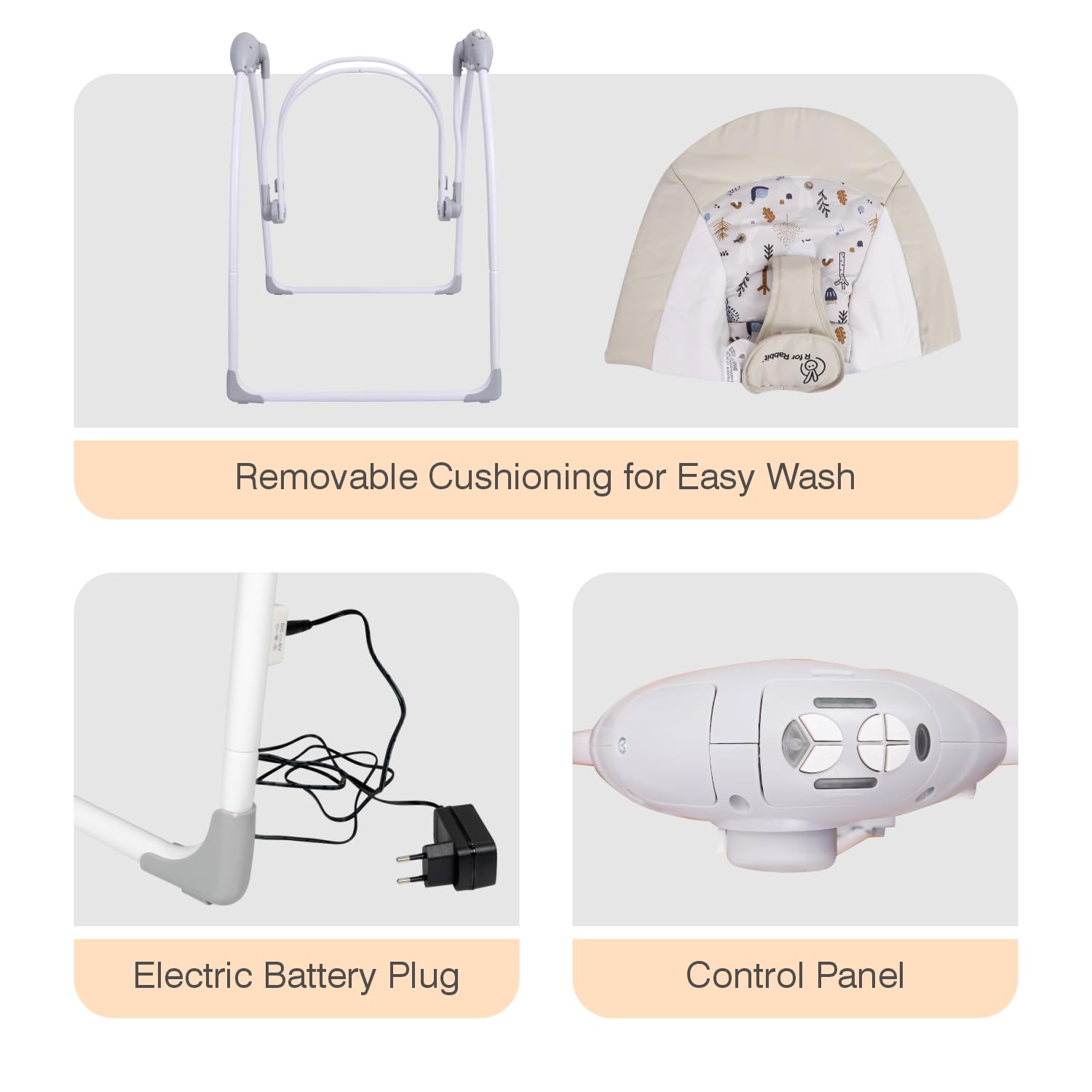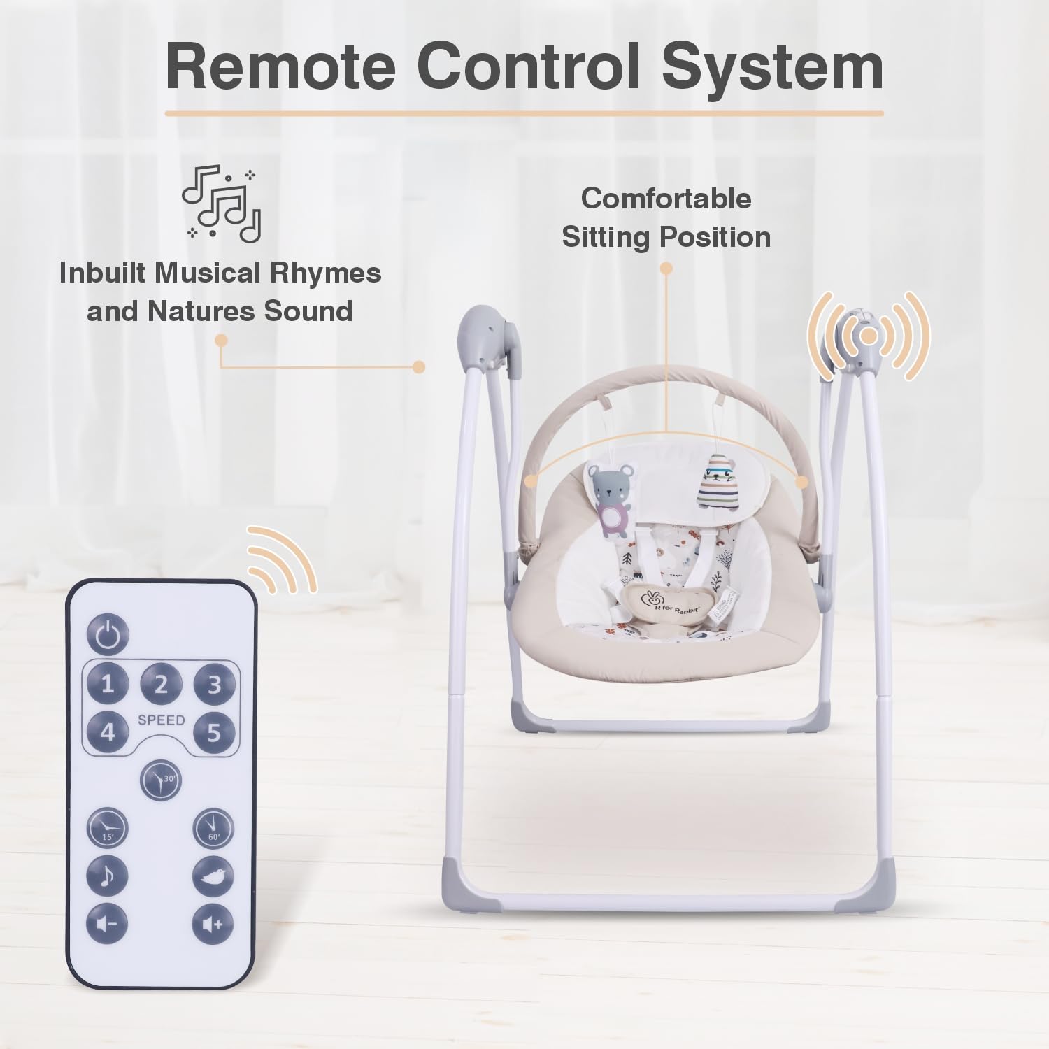 R for Rabbit Snicker Automatic Electric Swing for Kids, New Born Baby Jhula with Remote Controlled 5 Speed Level, Smart Timer, Natural Soothing Music and Hanging Toys